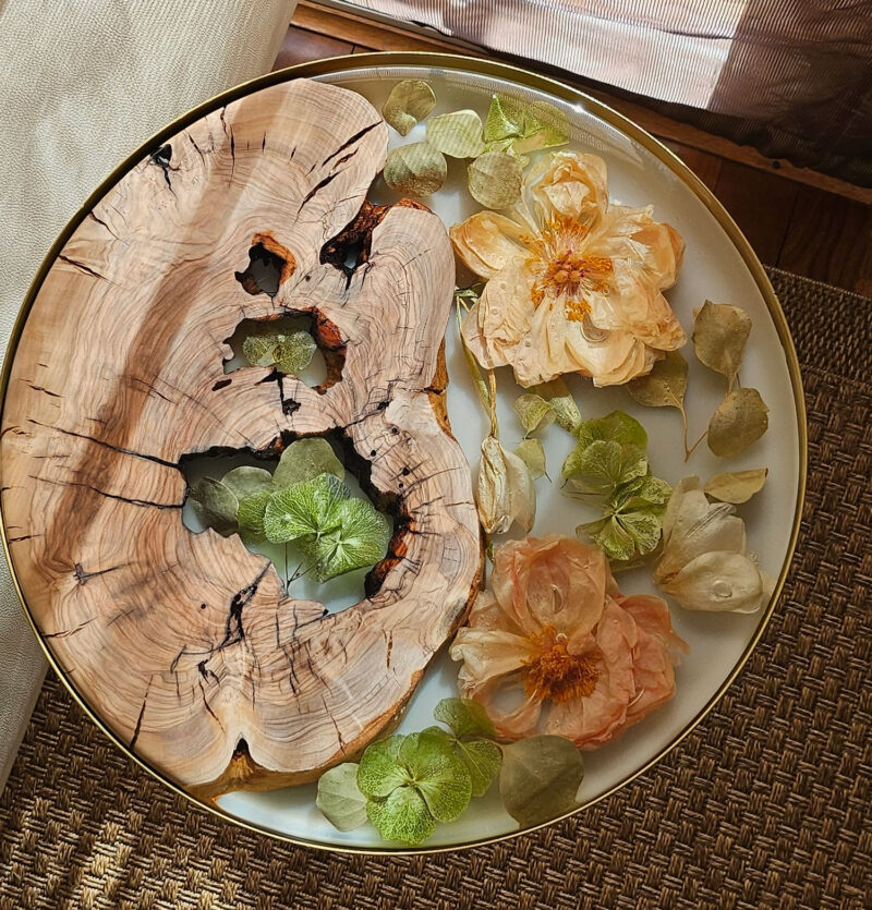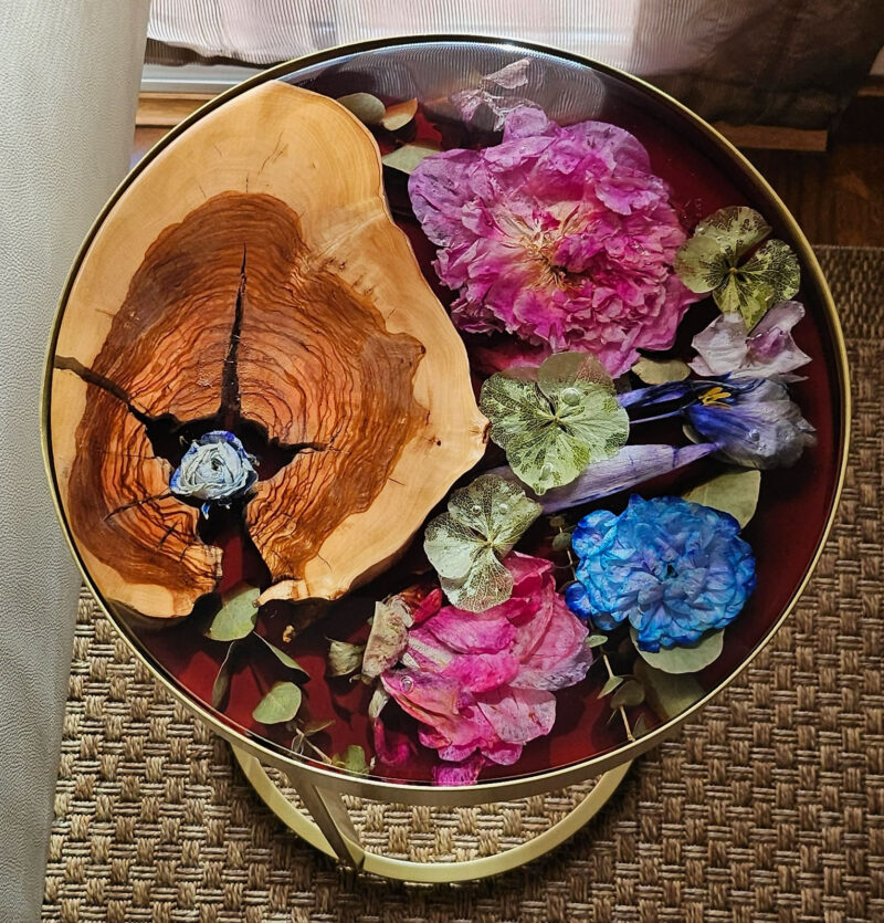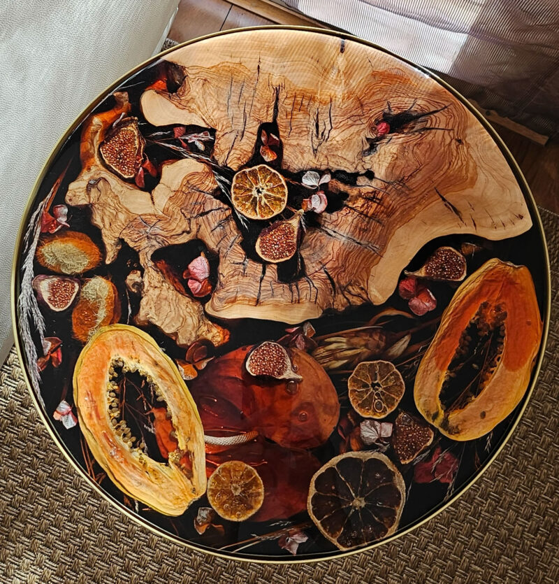 Mesa marrón epoxy flores y frutas